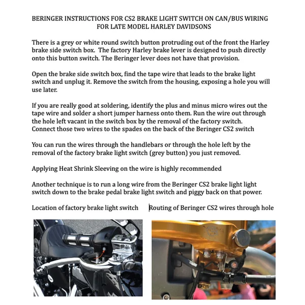 • Please check your stock wiring to make sure your model motorcycle will except analog switches. Some 2014 up models have ribbon wires and will not except tie-in.
