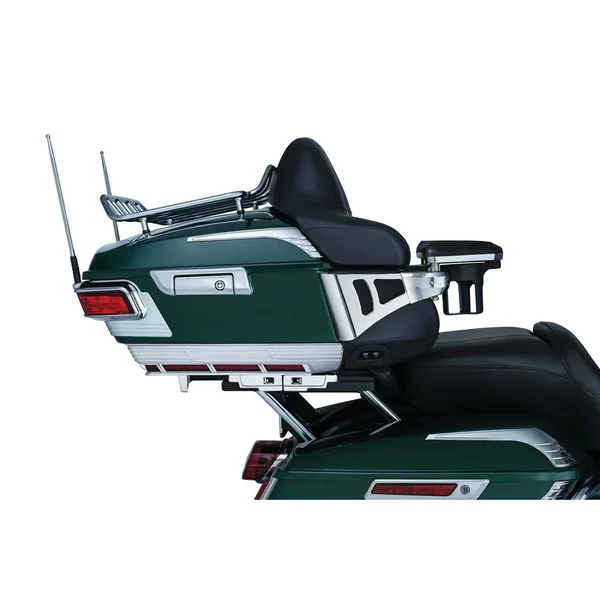 Give your passenger the freedom they deserve. Our Adjustable Tour-Pak Relocator does just that with a flip of the easily operated locking levers. Allows adjustment of the Tour-Pak from 1″ forward to 3″ back from the stock position without tools. Interlocking aluminum extrusions ensure smooth, controlled motion. The locking levers and rear accent panel are elegantly designed and beautifully chromed. An extended-length vinyl pad/wiring cover for the front of the Tour-Pak is included for a factory finish appearance. Enjoy the ride for miles ahead.